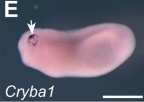 cryba1 (crystallin beta A1) gene expression in Xenopus laevis embryo, assayed via in situ hybridization, NF stage 26, lateral view, anterior left, dorsal up.