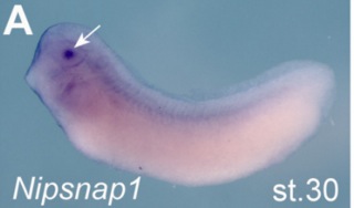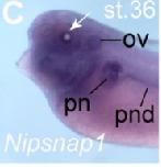 nipsnap1 ((nipsnap homolog 1)) gene expression in Xenopus laevis embryo, assayed via in situ hybridization, NF stage 32, lateral view, anterior left, dorsal up. |