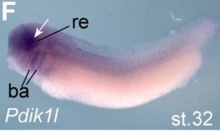 pdik1l (PDLIM1 interacting kinase 1 like) gene expression in Xenopus laevis embryo, assayed via in situ hybridization, NF stage 32, lateral view, anterior left, dorsal up. |