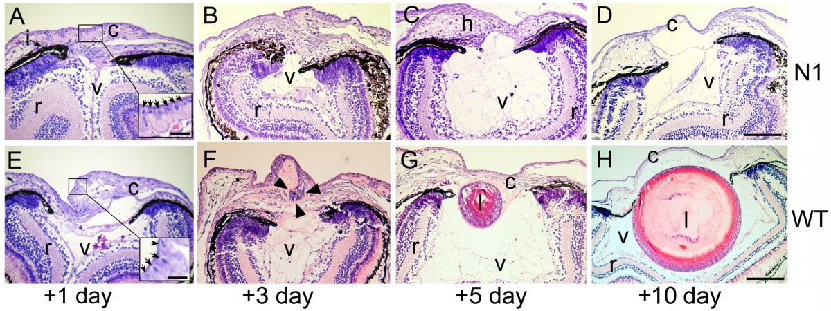 Figure 2. Histology of WT and BMP inhibited (N1) tadpole eyes following lentectomy. (A-D) Representative histological sections through the eyes of transgenic N1 tadpoles 1, 3, 5 and 7 days after lentectomy. Inset in A shows arrows pointing to columnar corneal cells (E-H) Representative sections of wild type eyes at 1, 3, 5 and 7 days after lentectomy. Inset in E indicates columnar corneal cells (arrows). Arrowheads in F indicate the forming lentoid moving into the vitreous. Both transgenic and wild type eyes were subjected to heat shock at -3, 24 and 48 hours relative to lentectomy. Abbreviations: c, cornea; h, hypertrophic cells; i, iris (pigmented epithelium); l, lens; r, retina; v, vitreous. Scale bars in D and H corresponds to 50 μm and applies to all panels. Inset scale bar in A and E corresponds to 10 μm. |
