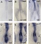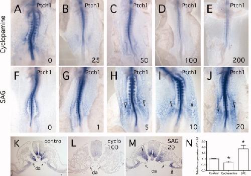 Figure 1. Characterization of cyclopamine inhibition and SAG activation of hedgehog (Hh) signaling in the chick embryo. In situ hybridization analysis for expression of the hedgehog receptor, Ptch1, as a readout for Hh signaling. AâE: Embryos were treated with increasing doses of cyclopamine (0â200 μM), commencing at the 7-somite stage, until the 10-somite stage (approximately 8 hr). Ptch1 expression was reduced as the concentration of cyclopamine increased. Expression was initially lost from the somites and lateral mesoderm and then more gradually from the notochord and the ventral neural tube. FâJ: Embryos treated with increasing concentrations of SAG (0â20 μM), commencing at the 7-somite stage, until the 10-somite stage. Ptch1 expression increased in a concentration-dependent manner. Regions of higher expression in the lateral plate mesoderm are indicated by arrowheads. KâM: Cross-sections through embryos treated as indicated and assayed for Ptch1 by in situ hybridization. K: Control embryo shows wild-type expression pattern of Ptch1 in the notochord, ventral neural tube, ventral somites, and more weakly in the lateral plate mesoderm. These last two expression domains are directly adjacent to the forming dorsal aortae (DA). L: Embryo treated with 100 μM cyclopamine. Expression of Ptch1 was almost completely absent, except for low levels in the ventral neural tube. M: Embryo treated with 20 μM SAG. Expression of Ptch1 appeared more intense in all regions compared with control. Ptch1 expression was now prominent in more dorsal regions of the somite and in the lateral plate mesoderm, which showed relatively low expression in the control embryo (K). Regions of increased Ptch1 expression in the somite and lateral plate, adjacent to the DA are indicated by the arrowhead. N: Quantitative PCR analysis of Ptch1 transcript levels. Results represent the average relative transcript levels from 3 embryos for each treatment. Both cyclopamine and SAG treatments are statistically different from controls (P < 0.05, Student's t-test, indicated by asterisks).Download figure to PowerPoint |
