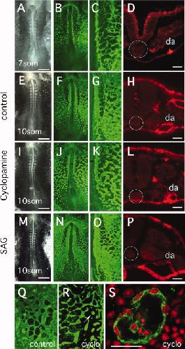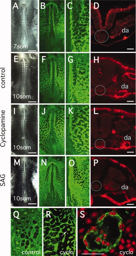 Figure 2. Antibody analysis of vascular formation in quail embryos treated with cyclopamine or SAG. Vascular tissues were detected using QH1 antibody. AâP: The first column shows bright field images of embryos, the second column shows identical embryos stained with QH1, the third column shows magnified images of the vascular plexus region and the fourth column, shows cross-sections through QH1-stained embryos at the level of the fifth somite. AâD: Characterization of embryos at the seven-somite stage, before initiation of treatment. At this stage, a complex network of vascular cords has assembled, but tubulogenesis has only commenced in the most anterior regions of the paired dorsal aortae (DA). Sections at the level of the fifth somite (D) show that angioblasts have assembled at the region of the future DA (da), but tube formation has not started. EâH: Characterization of control embryos at the 10-somite stage at the completion of treatment. The DAs are prominent continuous structures and an elaborate sinusoidal plexus has formed in the adjacent mesoderm. The section image (H) shows the presence of the tubular DA (da). IâL: Characterization of 10-somite stage embryos treated with cyclopamine. Relative to controls, the DA are narrower and much more irregular in appearance. The vascular plexus in less dense and in some places discontinuous. Despite the general disruption of vascular patterning, the section image (L) reveals that tube formation has occurred. MâP: Characterization of 10-somite stage embryos treated with SAG. Relative to controls the DA are wider and the vascular plexus is very dense. The section image at the level of the fifth somite shows the extremely large tubular DA (da). Q: QH1-stained vascular plexus from a control embryo at 10-somites. R: Equivalent region of the vascular plexus from an embryo treated with cyclopamine. In this pronounced example, the plexus has low density and many angioblasts exist in isolated aggregates rather than assembled into cords. S: Confocal image of the isolated angioblast aggregate (indicated by arrow in R), showing the presence of a lumen. QH1 is green, propidium iodide staining for nuclei is red. In panels D, H, L, P, the location of the notochord is indicated by the dotted circle. Scale bar in the first column is 0.5 mm, and in the last column is 100 micrometers. Scale bar = 50 μm in S.Download figure to PowerPoint |
