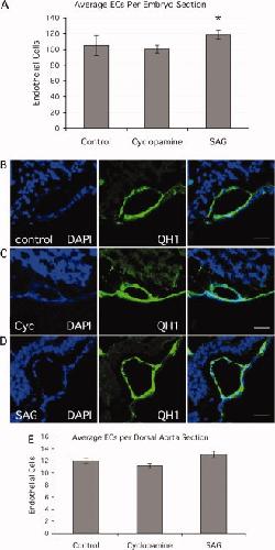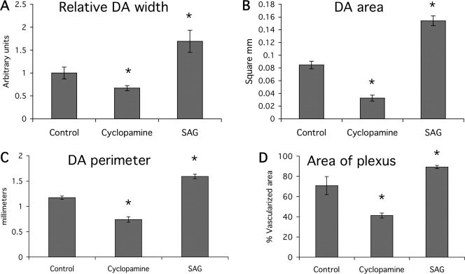 Figure 3. Quantitation of the structure of the dorsal aortae (DA) and the vascular plexus in quail embryos with inhibited and activated hedgehog (Hh) signaling. A: Relative width of the DA in control, cyclopamine and SAG-treated embryos. Measurements were made from photographs of QH1 stained whole-mount embryos. Measurements were made for each DA at five positions along the AP axis, including at least three embryos for each treatment. B: Measurements of DA area were made by analysis of digital photographs of QH1 stained sections using Image J. Measurements were made at five positions along the AP axis, including at least 3 embryos for each treatment. C: Measurements of DA perimeter (the length of the inside of the DA vessel wall) were made by Image J analysis of the same digital photographs used in (B). Measurements were made at five positions along the AP axis, including at least three embryos for each treatment. D: Area of the vascular plexus was determined by Image J analysis of digital photographs. At least five embryos were assayed for each treatment. In all cases, the measurements for cyclopamine and SAG treated embryos are significantly different from control values (P < 0.05, Student's t-test, indicated by asterisks).Download figure to PowerPoint |