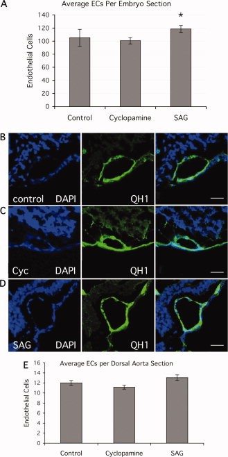 Figure 4. The number of cells comprising vascular structures is little changed after inhibition or activation of hedgehog (Hh) signaling. After experimental treatment, quail embryos were stained with QH1 to detect angioblasts and DAPI (4â²,6-diamidine-2-phenylidole-dihydrochloride) to mark nuclei. A: Endothelial cell (EC) number was determined by counting number of nuclei corresponding to QH1 stained cells. Five sections were counted for each embryo, with at least three embryos for each treatment. The number of ECs in SAG treated embryos is significantly different from controls and cyclopamine-treated embryos (asterisk). BâD: Determination of number of ECs comprising the dorsal aortae (DA). Confocal images of sections at approximately the level of the fifth somite. From left to right the panels show DAPI stain, QH1 stain and the merged image. Representative images are shown for a single DA in control (B), cyclopamine-treated (C) and SAG-treated embryos (D). Scale bar = 100 μm. E: Number of cells contributing to the wall of the DA. DAPI-stained nuclei contained in the wall of the vessels (QH1 stained) were counted. Cells in both DA were counted in at least five sections per embryo, for at least three embryos for each treatment. Despite differences in the size of the vessels, the number of ECs comprising the walls was unchanged by the different treatments.Download figure to PowerPoint |