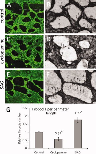 Figure 5. Relative number of EC filopodia correlates with hedgehog (Hh) signaling levels. After experimental treatment, quail embryos were stained with QH1 to mark endothelial cells (ECs) and images of the vascular plexus were obtained using confocal microscopy. A: Image of region of vascular plexus from posterior of embryo, adjacent to dorsal aorta (just out of frame at top), of control embryo. B: Inverted image (ECs are black) of region outlined in box in A. Filopodia extending from ECs are indicated by open arrowheads. C: Image of vascular plexus of cyclopamine treated embryo. Plexus region is equivalent to that in control. D: Inverted image of region outlined in box in C showing filopodia marked with arrowheads. E: Image of vascular plexus of SAG-treated embryo. Plexus region is equivalent to that in control. F: Inverted image of region outlined in box in E showing filopodia marked with arrowheads. G: Quantitation of relative number of filopodia following different treatments. Total number of filopodia were counted and then normalized against length of perimeter (edge). Length of perimeter was calculated using Image J. Plexus on both sides of midline was counted for at least three embryos for each treatment. Results show that the relative number of filopodia correlates with the level of Hh signaling and that both cyclopamine and SAG treatments are significantly different from controls (P < 0.05, Student's t-test, indicated by asterisks).Download figure to PowerPoint |
