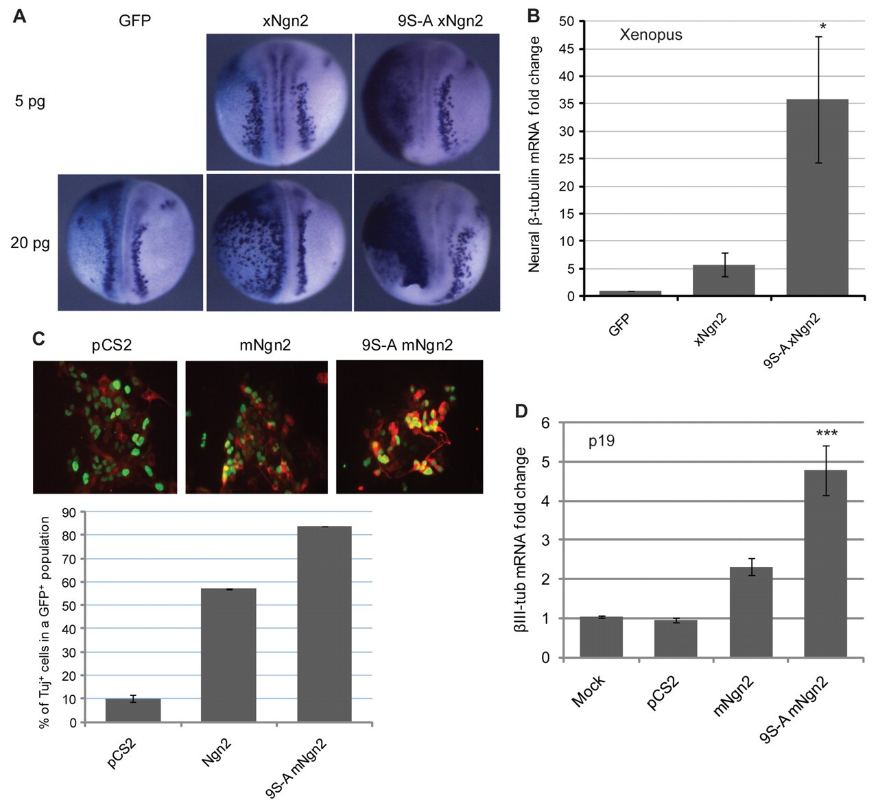 Fig. 3. Mutation of phosphorylation sites promotes Ngn2 activity. (A) Xenopus embryos were injected (left side) in one of two cells with either 5 or 20 pg mRNA as indicated, fixed at stage 15 and subject to in situ hybridisation for neural β-tubulin. The number of embryos scored was 39-90 per condition. (B) qPCR analysis of neural β-tubulin in stage 15 Xenopus embryos injected at the one-cell stage with 20 pg xNgn2 or 9S-A xNgn2 mRNA. Average fold increase in neural β-tubulin mRNA expression is shown normalised to GFP-injected control (mean ± s.e.m.; *, Pâ¤0.05). (C) Mouse P19 cells transfected with mNgn2 or 9S-A mNgn2 with GFP were fixed 24 hours after transfection and stained for expression of neuron-specific βIII-tubulin (TuJ1) (red), quantitating TuJ1+ among GFP+ cells (mean ± s.e.m.). (D) qPCR analysis of βIII-tubulin in P19 cells 24 hours following transfection with mNgn2 and 9S-A mNgn2. Average fold increase in mRNA expression is shown normalised to housekeeping gene expression (mean ± s.e.m.; ***, Pâ¤0.005).