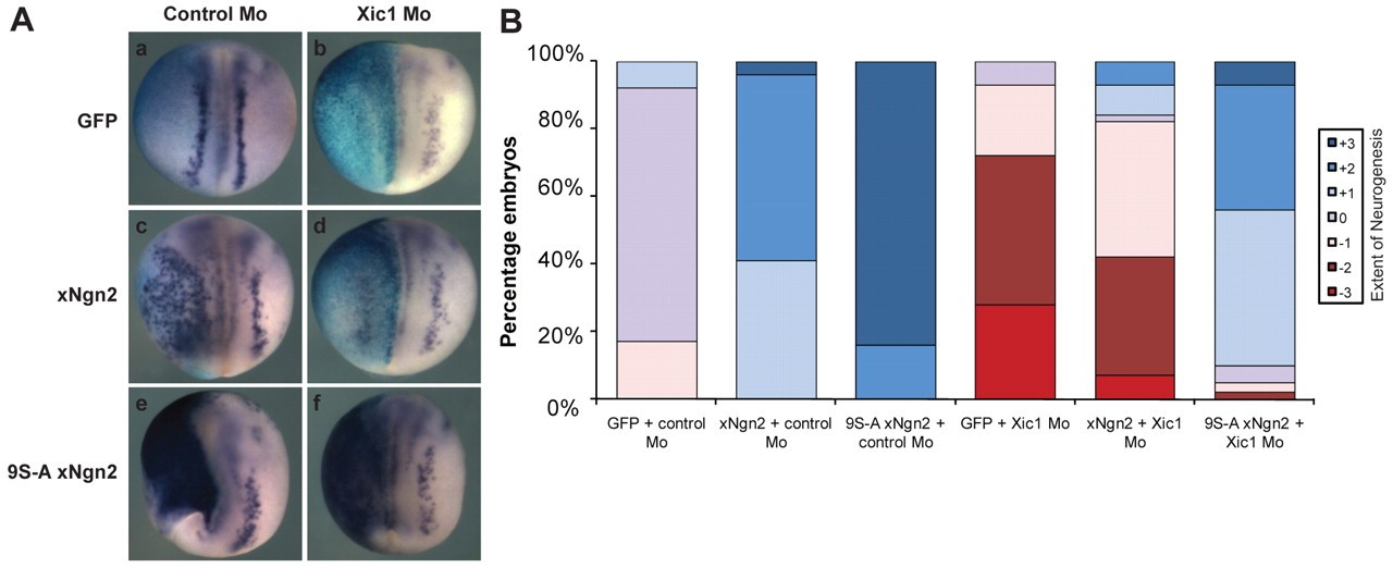 Fig. 7. 9S-A xNgn2 does not require the cdk inhibitor Xic1 for activity. (A) Xenopus embryos were injected (left side) in one of four cells (dorsally targeted) with 20 pg mRNA as indicated, together with 20 ng of either control (a,c,e) or Xic1 (b,d,f) morpholino, fixed at stage 15 and subject to in situ hybridisation for neural β-tubulin expression. (B) Semi-quantitative analysis of in situ hybridisation data. The number of embryos scored was 43-59 per condition. Neurogenesis was enhanced (+3, +2, +1), the same as (0) or reduced (â1, â2, â3) compared with the uninjected side (see Fig. S8 in the supplementary material for examples of the scoring method).
