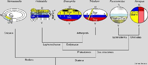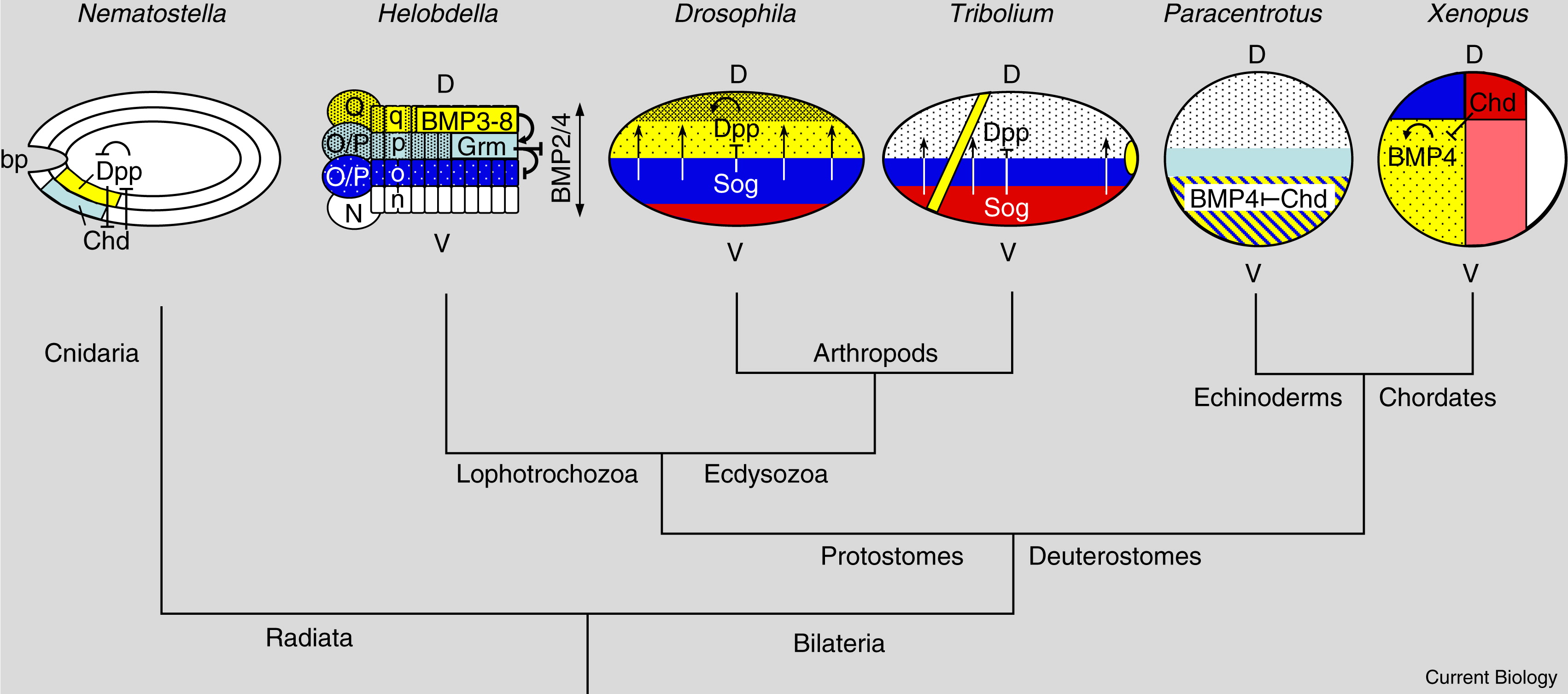 Key features of BMP signaling in embryos of diverse organisms: the sea anemone Nematostella, the leech Helobdella, studied by Kuo and Weisblat [10], the insects Tribolium and Drosophila, the sea urchin Paracentrotus and the frog Xenopus. Phylogenetic relationships are indicated by the tree, which is not drawn to scale. Note that the dorsoventral (D-V) axis appears to have undergone an inversion in the chordate lineage, which includes vertebrates 1 and 11. Red/pink indicates mesoderm; dark blue indicates CNS neuroectoderm; yellow indicates the domain of BMP expression, which corresponds to epidermal ectoderm in vertebrates, Drosophila, and Helobdella; the stippled region indicates region of known BMP activity, darker stippling indicates higher levels of activity; vertical arrows indicate vectorial Sog/Chd-mediated transport of BMPs. D = Dorsal; V = Ventral; Chd = Chordin; Grm = Gremlin; bp = blastopore. For more complete descriptions of the interactions between BMP pathway components in ectoderm patterning, see 11, 13 and 14.