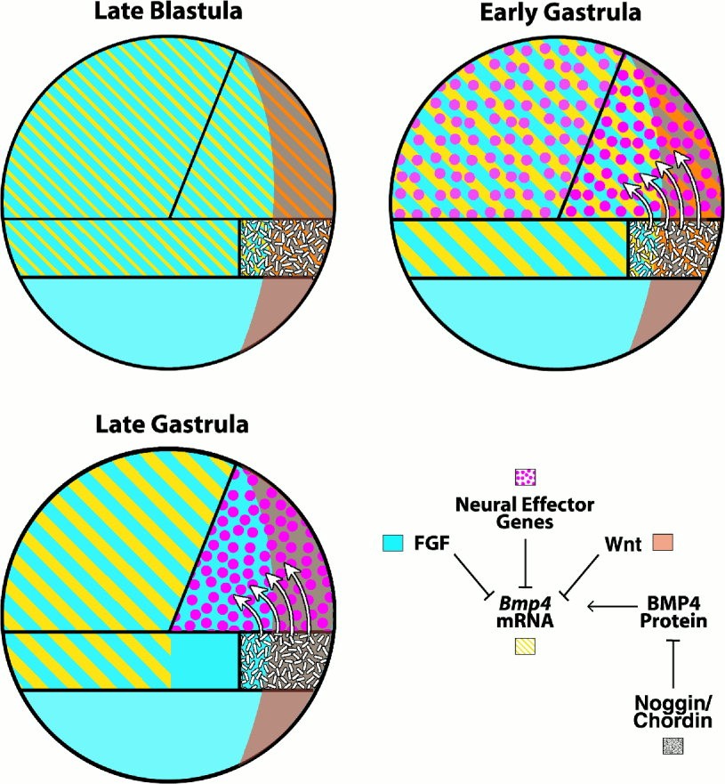 Figure 1. Additive pathways may regulate Bmp expression to neuralize ectoderm. In the schematized Xenopus late blastulaembryo, FGF signaling (blue) is ubiquitous with potentially higher levels in the animal and marginal zones (LaBonne and Whitman, 1997; Uzgare et al., 1998; Christen and Slack, 1999; Curran and Grainger, 2000). Low levels of Bmp4 mRNA (yellow) are also found throughout the animal and marginal zones (Fainsod et al., 1994; Hemmati-Brivanlou and Thomsen, 1995; Nikaido et al., 1997; Streit et al., 1998; Dick et al., 2000; Wilson et al., 2000). Active Wnt pathway signaling (nuclear localized beta-catenin)(orange) occurs along the entire future dorsal side of the embryo (reviewed in Moon and Kimelman, 1998). BMP protein antagonists begin to be expressed in the organizer (white speckles)(Sasai, 1998; Chitnis, 1999; Streit and Stern, 1999c; Weinstein and Hemmati-Brivanlou, 1999; Harland, 2000; Robertis and Arechaga, 2001). By the early gastrula stage, Bmp4 mRNA levels have increased throughout the animal and marginal zones. The Wnt and FGF signaling pathways are still active as are BMP protein antagonists produced by the organizer. Neural effector genes begin to be expressed; some are localized to the presumptive neural territory (dark pink) whereas others are expressed throughout the animal hemisphere (light and dark pink)(Sasai, 1998; Chitnis, 1999; Streit and Stern, 1999c; Weinstein and Hemmati-Brivanlou, 1999; Harland, 2000; Robertis and Arechaga, 2001). By the late gastrula stages, Bmp4 mRNA has been cleared from the prospective neuroectoderm and dorsal marginal zone. Neural effector gene expression is localized to the prospective neural territory or subdomains within this territory. Lower right panel: the FGF and Wnt pathways and some of the neural effector genes can negatively regulate Bmp expression to neuralize tissue. As BMP activity can maintain Bmp expression, BMP protein antagonists could also indirectly affect Bmp expression levels (Hammerschmidt et al., 1996; Piccolo et al., 1997; Nguyen et al., 1998).Download figure to PowerPoint