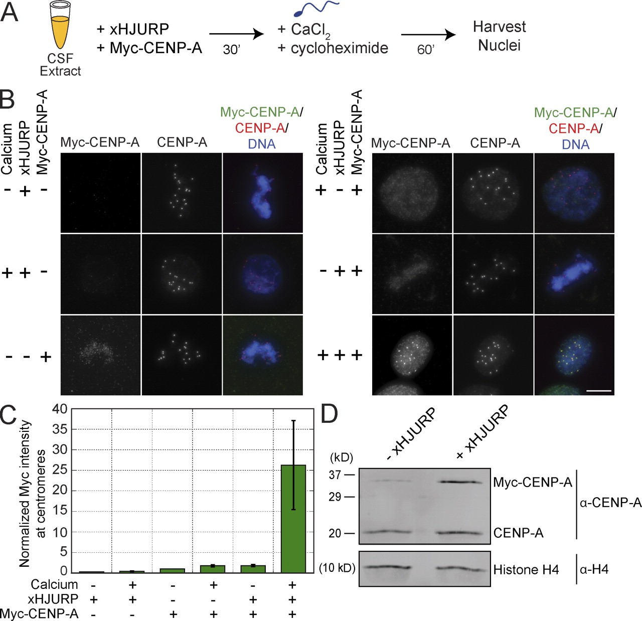 Figure 1. CENP-A assembly in Xenopus extracts requires xHJURP addition and mitotic exit. (A) Schematic of xHJURP-mediated CENP-A assembly assay in Xenopus egg extract. (B) Representative images from xHJURP-mediated CENP-A assembly assay. The staining for mycâCENP-A, total CENP-A, or the merge of mycâCENP-A, total CENP-A, and DNA is indicated above the images. Calcium, xHJURP, or mycâCENP-A addition is shown to the left of each image row. Bar, 10 µm. (C) Quantification of mycâCENP-A fluorescence intensity at centromeres for the assembly reactions represented in B, normalized to the metaphase control sample without xHJURP but with mycâCENP-A RNA added (â/â/+). Mean per pixel intensity at centromeres was quantified, and >200 centromeres were quantified per condition. Error bars show SEM; n = 4. (D) Western blot of chromatin fractions from CENP-A assembly reactions performed in the presence (+) of calcium, Myc-CENP-A, and xHJURP (+/+/+) or in the presence of calcium and Myc-CENP-A but lacking (â) xHJURP (+/â/+). Histone H4 was used as a loading control. n = 3. |