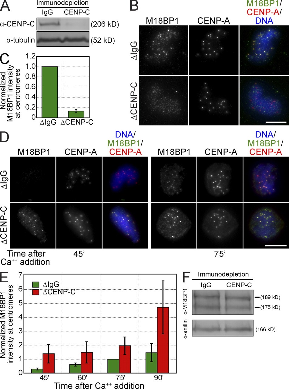 Figure 4. CENP-C is required for M18BP1 assembly at metaphase centromeres in Xenopus egg extract. (A) Representative Western blot of mock- and CENP-Câdepleted extracts. CENP-C depletion led to a >90% reduction in CENP-C levels. Tubulin was used as a loading control. (B) CENP-C depletion prevented M18BP1 assembly at centromeres in metaphase. Xenopus sperm chromatin was incubated in mock- or CENP-Câdepleted metaphase extracts and stained for M18BP1 and CENP-A. The depletion conditions are listed to the left of the images, and immunolocalized proteins are listed above. (C) Quantification of M18BP1 fluorescence intensity at metaphase centromeres (normalized to the levels in mock-depleted extracts) after CENP-C depletion. Quantification was performed as described in Fig. 1. Error bars show SEM; n = 3. (D) CENP-C depletion led to premature, increased association of M18BP1 at interphase centromeres. Xenopus sperm chromatin was incubated in mock- or CENP-Câdepleted extracts and stained for M18BP1 at various time points after release from metaphase arrest. Depletion conditions are listed to the left of the images, time (minutes) after calcium addition is listed below the images, and immunolocalized proteins are listed above. (E) Quantification of M18BP1 fluorescence intensity at centromeres in mock- and CENP-Câdepleted extracts at various time points after release from metaphase arrest as described in D. Values are normalized to the levels in mock-depleted extracts 75 min after calcium addition. Quantification was performed as described in Fig. 1. Error bars show SEM; n = 3. (F) CENP-C depletion does not significantly affect M18BP1 levels in extract. Mock- and CENP-Câdepleted extracts were Western blotted for M18BP1 and Anillin as a loading control. M18BP1-1 and M18BP1-2 levels in CENP-Câdepleted extracts are 77 ± 8 and 92 ± 11% of control extracts, respectively (n = 3; error = SEM). Bars, 10 µm. |