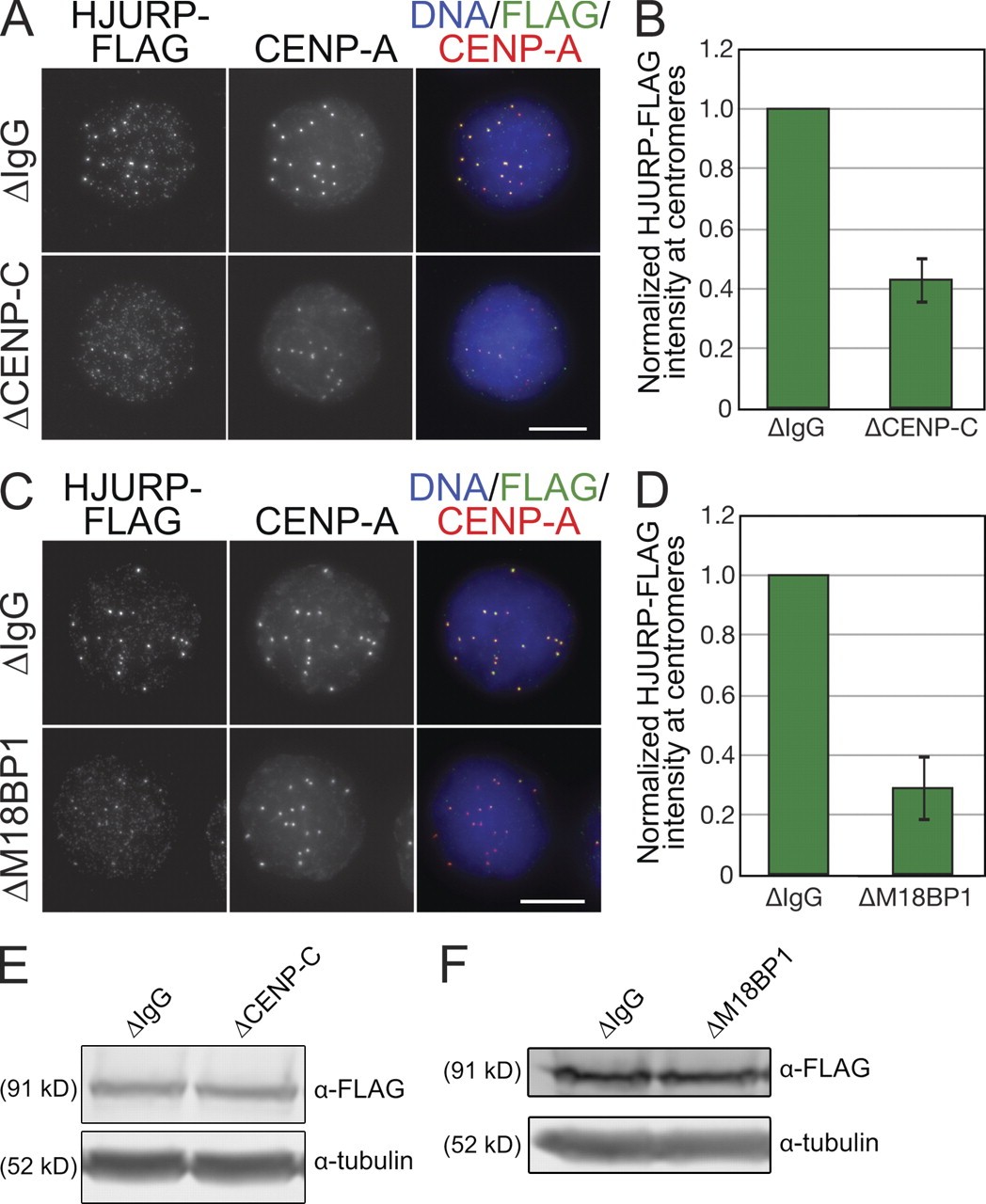 Figure 5. CENP-C and M18BP1 promote the recruitment of HJURP to centromeres. (A) CENP-C depletion inhibited HJURP assembly at centromeres. Xenopus sperm chromatin was incubated in mock- or CENP-Câdepleted extracts supplemented with HJURP-FLAG protein and stained for FLAG and CENP-A. The depletion conditions are listed to the left of the images, and immunolocalized proteins are listed above. (B) Quantification of HJURP-FLAG fluorescence intensity at centromeres (normalized to the levels in mock-depleted extracts) after CENP-C depletion. Quantification was performed as described in Fig. 1. (C) M18BP1 depletion inhibited HJURP assembly at centromeres. Xenopus sperm chromatin was incubated in mock- or M18BP1-depleted extracts supplemented with HJURP-FLAG and stained for FLAG and CENP-A. The depletion conditions are listed to the left of the images, and immunolocalized proteins are listed above. (D) Quantification of HJURP-FLAG fluorescence intensity at centromeres (normalized to the levels in mock-depleted extracts) after M18BP1 depletion. Quantification was performed as described in Fig. 1. (E) Representative Western blot from HJURP-targeting assay described in A showing that equal amounts of the HJURP-FLAG protein were added to mock- and CENP-Câdepleted extracts. Tubulin is shown as a loading control. (F) Representative Western blot from HJURP-targeting assay described in C showing that equal amounts of the HJURP-FLAG protein were added to mock- and M18BP1-depleted extracts. Tubulin is shown as a loading control. Error bars show SEM; n = 3. Bars, 10 µm. |