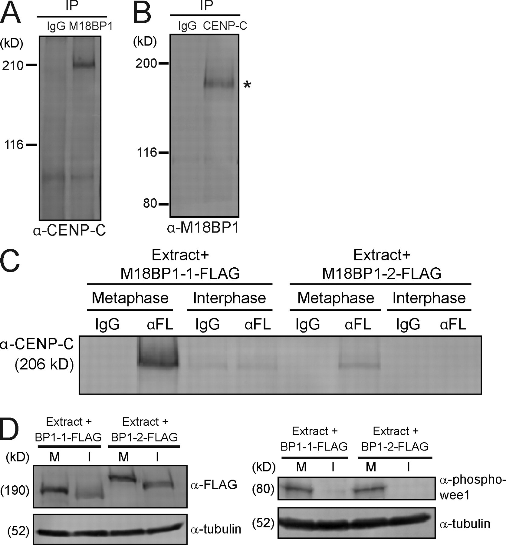 Figure 7. CENP-C associates with M18BP1-1 in metaphase extract. (A) M18BP1 coprecipitates CENP-C from Xenopus egg extract. Western blot for CENP-C after immunoprecipitation (IP) of metaphase Xenopus extract with IgG or α-M18BP1. (B) CENP-C coprecipitates M18BP1 from the Xenopus egg extract. Western blot for M18BP1 after immunoprecipitation of metaphase Xenopus extract with IgG or αâCENP-C. We only detected a single M18BP1 isoform (asterisk) coprecipitating with CENP-C, which migrates at the molecular mass of isoform 1. (C) M18BP1-1 associates with CENP-C in metaphase extract. FLAG epitopeâtagged M18BP1 IVT proteins were added to metaphase or interphase extracts, reactions were split in half, and M18BP1-FLAG proteins were immunoprecipitated with control (IgG) or α-FLAG (αFL) antibodies. A Western blot of the immunoprecipitates for CENP-C is shown. (D) Representative Western blots from immunoprecipitation experiments described in C. Samples were taken after incubation of M18BP1-FLAG proteins in extract. (left) α-FLAG Western blot; (right) phospho-wee1 Western blot to assess the cell cycle state of the extract. M and I indicate metaphase and interphase extract, respectively. The molecular masses of protein standards and individual proteins in kilodaltons are listed on the left of each blot. |