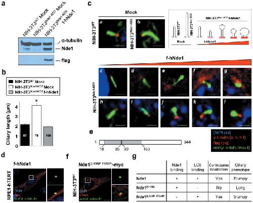 The primary cilium is an antenna-like organelle that is dynamically regulated during the cell cycle. Ciliogenesis is initiated as cells enter quiescence, whereas resorption of the cilium precedes mitosis. The mechanisms coordinating ciliogenesis with the cell cycle are unknown. Here we identify the centrosomal protein Nde1 (nuclear distribution gene E homologue 1) as a negative regulator of ciliary length. Nde1 is expressed at high levels in mitosis, low levels in quiescence and localizes at the mother centriole, which nucleates the primary cilium. Cells depleted of Nde1 have longer cilia and a delay in cell cycle re-entry that correlates with ciliary length. Knockdown of Nde1 in zebrafish embryos results in increased ciliary length, suppression of cell division, reduction of the number of cells forming the Kupffer's vesicle and left-right patterning defects. These data suggest that Nde1 is an integral component of a network coordinating ciliary length with cell cycle progression and have implications for understanding the transition from a quiescent to a proliferative state.