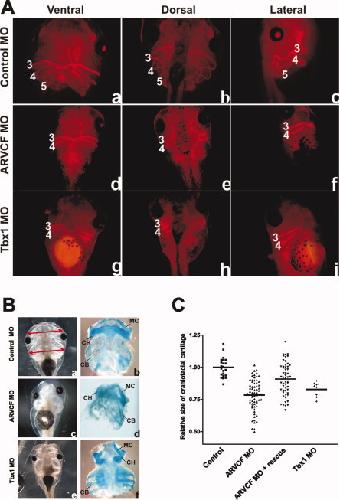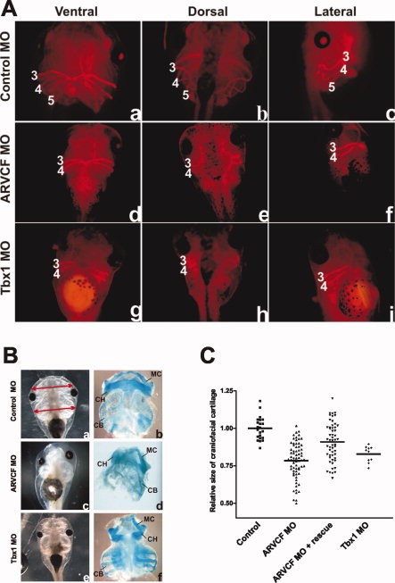 Figure 2. Defects in the aortic arches and the craniofacial skeleton after depletion of ARVCF or Tbx1. A: To evaluate aortic arch formation, 50 ng of ARVCF MO or control MO was injected at the eight-cell stage (dâf), or 50 ng Tbx1 MO (gâi) or control MO (aâc) at the one-cell stage. To visualize the aortic arches, embryos were fixed at stage 48 and stained with the von Willebrand factor antibody. This antibody stains mainly the aortic arches (aa) connected to the heart (arches are numbered). At this stage, three pairs of aortic arches are normally present: arches 3, 4, and 5. Depletion of ARVCF frequently results in total loss of aortic arch 5 and less developed arches 3 and 4 (dâf). Knockdown of Tbx1 also results in defects in aortic arch development (gâi). Again, aortic arch 5 is often missing while the others are less developed. B: Embryos were injected at the four- or eight-cell stage in two dorsal blastomeres with 50 ng ARVCF MO (c,d), or at the one-cell stage with 50 ng Tbx1 MO (e,f) or control MO (a,b). Tadpoles are shown at stage 48 either alive (left) or fixed and stained with Alcian Blue to reveal the cartilage structures (right). Knockdown of ARVCF or Tbx1 results in malformation of the cartilage structures of the head. Meckel's cartilage (MC) and the ceratohyalcartilage (CH) are malformed. The ceratobranchial cartilage (CB) is also affected in tadpoles injected with ARVCF MO or Tbx1 MO. C: The heads of embryos injected with ARVCF MO or Tbx1 MO were significantly narrower than those of control embryos (P < 0.0001), and this phenotype could be rescued by coinjection with 20 pg of ARVCF RNA that lacks the 5â²UTR and can not be targeted by the morpholino (P < 0.0001).Download figure to PowerPoint