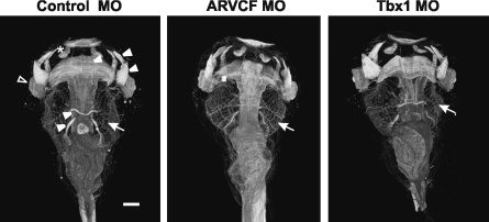 Figure 3. Three-dimensional reconstructions of CT-scanning images of embryos injected with ARVCF or Tbx1 MO (scale bar = 0.25 mm). Embryos at the four-cell stage were injected in one dorsal blastomere with 40 ng of Control MO, ARVCF MO, or Tbx1 MO, together with a fluorescent tracer. Tadpoles were fixed at stage 48 and subjected to CT-scanning. All reconstructions are shown in ventral view. Structures visible are the eyes (open arrowhead), the olfactory placode and vomeronasal organ (asterisk), the cranial muscles (closed arrowheads), and the branchial basket (arrows). The 3D-reconstructions reveal that injection of ARCVF MO or Tbx1 MO results in the reduction of the gill apparatus (arrows).Download figure to PowerPoint