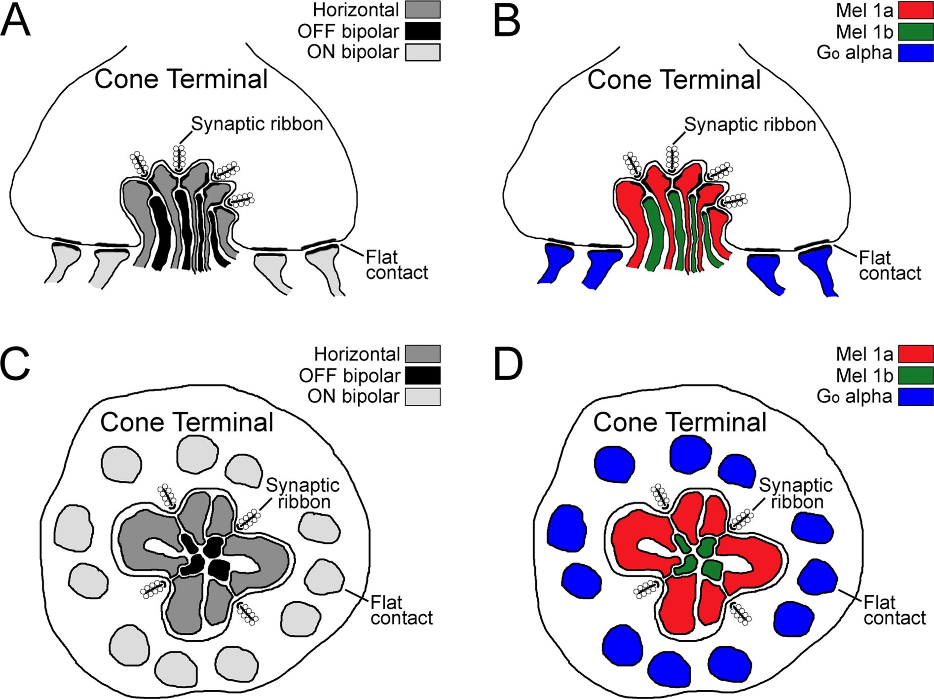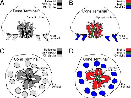 Figure 9. Schematic model of the relationship between melatonin receptors and functional organization of connections among Xenopus cones and bipolar and horizontal cell processes. A,C: Schematic summary of the predicted organization of horizontal, OFF bipolar, and ON bipolar cell processes at cone terminals in the Xenopus retina shown in the vertical (A) and horizontal (C) orientation. B,D: Schematic summary of the organization of Mel1a and Mel1b receptors at cone terminals in the Xenopus retina shown in the vertical (B) and horizontal (D) orientation.