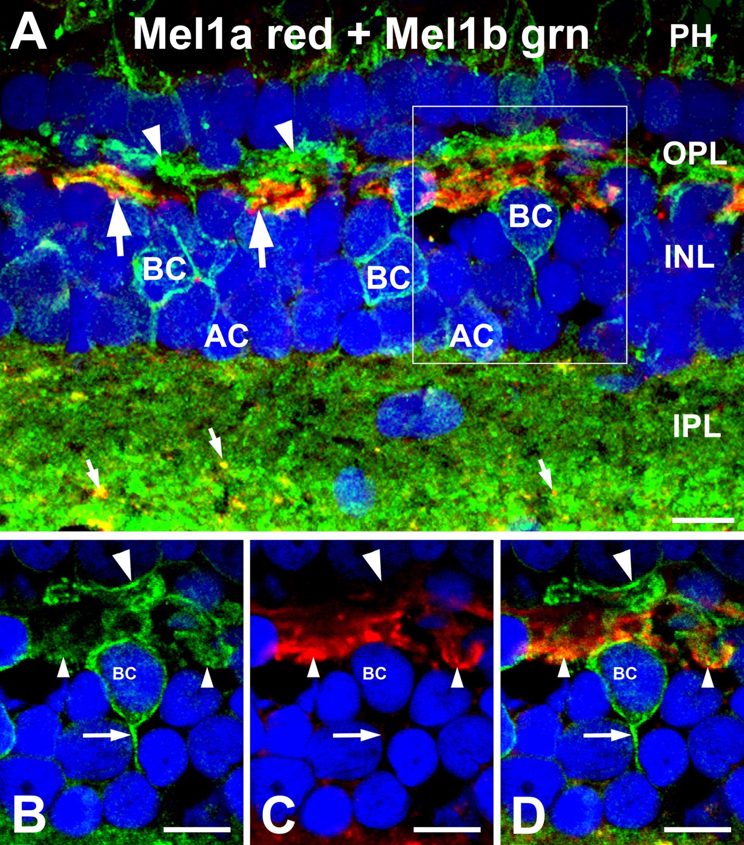 Figure 1. Mel1a and Mel1b receptors are differentially distributed in the outer retina. A: Mel1a immunoreactivity (red) in the outer plexiform layer (OPL) is present in large processes (arrows) morphologically similar to horizontal cell axons. Mel1b immunoreactivity (green) in the OPL is present in a distinct set of slender processes that form periodic clusters (arrowheads). Mel1b labeling is also present in the cell bodies of bipolar and amacrine cells (BC and AC, respectively) in the inner nuclear layer (INL). Mel1b labeling is also present at the level of the photoreceptor inner segments (PH). Mel1a and Mel1b receptors show differential distribution in the inner plexiform layer (IPL). Mel1b receptors are diffusely distributed throughout the IPL, but Mel1a receptors are found in discrete puncta (small arrows). The box in (A) indicates the area that is shown at higher magnification in (BâD). The confocal image is comprised of 16 optical slices of â400 nm. BâD: Examination of single confocal optical planes confirms that Mel1a and Mel1b localize to distinct processes in the OPL. Single optical slice of â400 nm is shown in BâD. B: Mel1b is present in slender processes arising from bipolar cells (BC) that form clusters in the distalOPL (large arrowhead). Mel1b labeling also is present in bipolar cell axons (arrow). C: Mel1a labeling is present in relatively large processes (small arrowheads). D: Overlay of panels B,C. Nuclei are counterstained with DAPI (blue) in all panels. Scale bars = 10 μm in all panels.