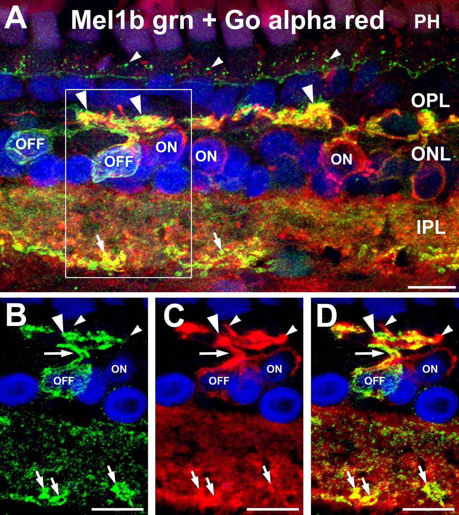 Figure 4. Mel1b receptors are expressed by OFF bipolar cells. A: Double labeling for Mel1b receptors (green) and the ON bipolar cell marker Goα (red) shows that Mel1b receptor-immunoreactivity is absent from the cell bodies of ON bipolar cells (ON), identifying the Mel1b receptor-immunoreactive bipolar cells as OFF bipolar cells (OFF). Confocal image stack comprised of seven optical slices of 400 nm each. Apparent colocalization of Mel1b and Goα immunoreactivity in processes in the outer plexiform layer (OPL) is due to their close proximity and the relative thickness of the image stack, and does not represent genuine colocalization (see panels BâD, below). Immunolabeling for both Mel1b and Goα is present in the inner plexiform layer (IPL), with strongly Mel1b-positive processes (small arrows) present along the inner margin of the layer. Mel1b immunoreactive puncta (small arrowheads) are also present at the level of the outer limiting membrane (OLM). The box in (A) indicates area shown in panels BâD. BâD: Examination of a single confocal optical plane confirms that Mel1b labeling does not colocalize with labeling for Goα in ON bipolar cells. Images in panels BâD represent a single optical slice of â400 nm. B: Mel1b immunoreactivity in the cell body and primary and secondary dendrites (arrow and large arrowhead respectively) of a bipolar cell (OFF). C: ON bipolar cell dendrites labeled for Goα (small arrowheads). D: Overlay of panels B,C showing that ON bipolar cell dendrites are devoid of Mel1b receptor labeling. Nuclei are counterstained with DAPI (blue) in all panels. INL, inner nuclear layer; PH, photoreceptor inner segments. Scale bars = 10 μm in all panels.