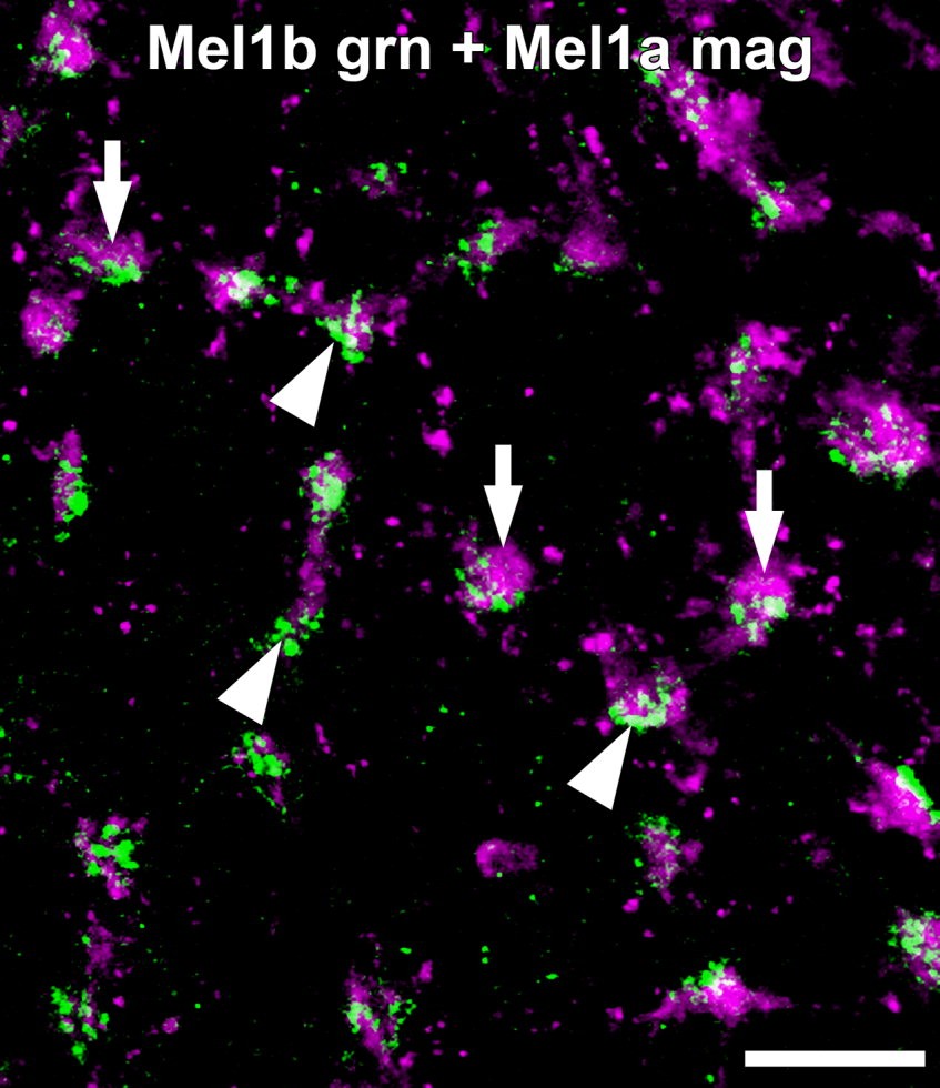 Figure 8. Mel1b receptor-immunoreactive OFF bipolar cell dendrites and Mel1a receptor-immunoreactive horizontal cell axons contact the same cone terminals. Immunolabeling for Mel1b (green) and Mel1a (magenta) in a retinal flatmount focused at the level of the outer plexiform layer (OPL). Mel1b-immunoreactive OFF bipolar cell dendrites (arrowheads) and Mel1a-immunoreactive horizontal cell axons (arrows) selectively contact the same cone terminals. Confocal image stack comprised of seven optical slices of ≈400 nm each. Scale bar = 10 μm.