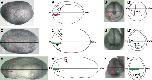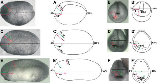 Fig. 2. Standardization of measurements for dye injections at neural plate stages (stage 13/14; A, Aâ², B, Bâ²), at the end of neurulation (stage 19/20; C, Câ², D, Dâ²), and at early tail bud stages (stage 23/24; E, Eâ², F, Fâ²). Lateral views in A, Aâ², C, Câ², E, Eâ² and frontal views in B, Bâ², D, Dâ², F, Fâ². At the neural plate stage, outlines of neural folds are indicated (Aâ², Bâ²). At neural fold and tailbud stages, double outlines are drawn for frontal views (Dâ², Fâ²) to indicate that embryos are narrower rostral (inner outline) than further caudal (outer outline). Immediately after labeling with DiI (red) or DiO (green), embryos were photographed in a precisely oriented lateral (A, C, E) or frontal position (B, D, F). The position of labeled cells (green or red dots in Aâ²âFâ²) along the anteroposterior axis (aâp) and their perpendicular distance from the dorsal edge of the neural folds (Nf-Inj.; Aâ²) or from the dorsal edge of the neural tube (Nt-Inj.; Câ², Eâ²) were measured in lateral views. The position of the anteriormost labeled cells was determined in frontal views by measuring their position along the leftâright axis (râl) and from the inner neural folds (iNF-Inj.; stage 13/14; Bâ²) or from the border of the cement gland (cg-Inj.; stages 19/20 and 23/24; Dâ², Fâ²). All distances were expressed as a percentage of the total length (lateral views) or width (frontal views) of the embryo. Red and green arrows in Aâ²âFâ² illustrate the measured distances. Abbreviation: cg: cement gland. |