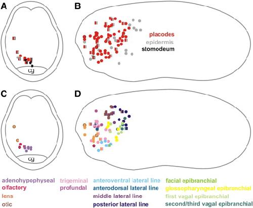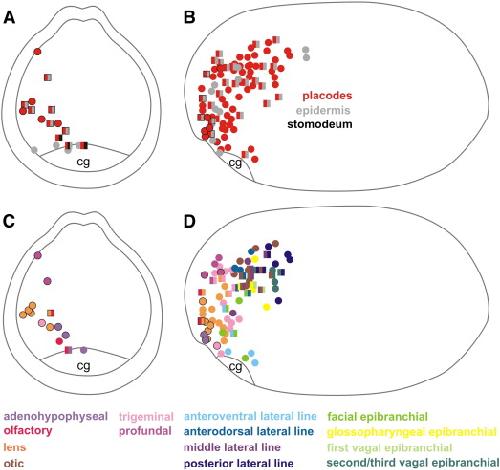 ig. 7. Fate map of Xenopus dorsal cranial non-neural ectoderm at the end of neurulation (stage 19/20). Each symbol represents one dye injection, which contributes to precursors of a single placode or epidermis (circle) or to multiple placodes and/or epidermis (square). Black outlined circles and squares represent injections shown in frontal as well as in lateral views. Frontal views are shown in A and C, lateral views in B and D. A, B: Positions of placodal precursors (red symbols) within the non-neural ectoderm in relation to epidermal (light gray symbols) or stomodeal precursors (black symbols). C, D: Positions of precursors for different types of placodes (color coded as indicated). Overlap and co-labeling between anterior placodes has decreased but is still extensive for posterior placodes. Abbreviation: cg: cement gland. For detailed explanation see text. |