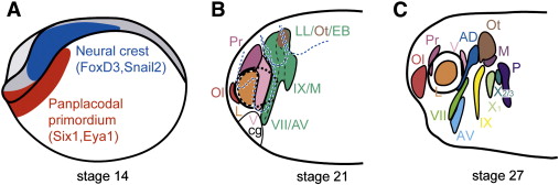 Fig. 1. Schematic overview of placodal development in Xenopus laevis (lateral views). A: Neural plate stage embryo showing the approximate position of the panplacodal primordium giving rise to all placodes. B: After neural fold closure, placodal areas giving rise to different placodes are closely apposed. Otic, epibranchial and lateral line placodes will all arise from a posterior placodal area (turquoise; region of prospective otic placode shown in brown). Neural crest streams are shown as blue broken lines. C: At tailbud stages, individual placodes have segregated (same color code as in fate maps shown in Figs. 6â8). Abbreviations: VII: facial epibranchial placode; IX: glossopharyngeal epibranchial placode; X1: first vagal epibranchial placode; X2/3: second and third vagal epibranchial placodes (fused); AD: anterodorsal lateral line placode; AV: anteroventral lateral line placode; L: lens placode; LL/Ot/EB: posterior placodal area, from which lateral line (LL), otic (Ot) and epibranchial (EB) placodes develop; M: middle lateral line placode, Ot: otic placode; Ol: olfactory placode; P: posterior lateral line placode; Pr: profundal placode; V: trigeminal placode.