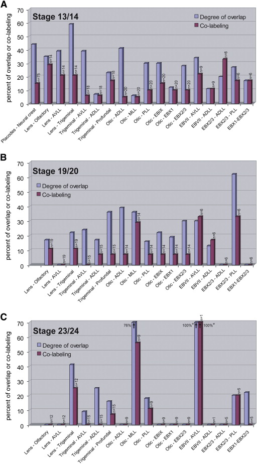 Fig. 5. Overlap versus co-labeling of selected adjacent placodes at neural plate stages (A), at the end of neurulation (B) and at early tailbud stages (C). The degree of overlap (blue columns) was measured as percent of area of origin of first placode which overlapped with area of origin of second placode. Areas were defined by polygons enclosing all injection sites giving rise to a particular placode in fate maps and measured with ImageJ. Co-labeling (maroon columns) was determined as percent of all injection sites contributing to first placode (n) which also contributed to second placode. Columns marked with an asterisk in C are not very informative since the facial epibranchial placode was labeled by only a single injection site. Abbreviations: ADLL: anterodorsal lateral line; AVLL: anteroventral lateral line; EBVII: Facial epibranchial; EBIX: Glossopharyngeal epibranchial; EBX1: First vagal epibranchial; EBX2/3: Second and third vagal epibranchial; MLL: middle lateral line; PLL: posterior lateral line. |
