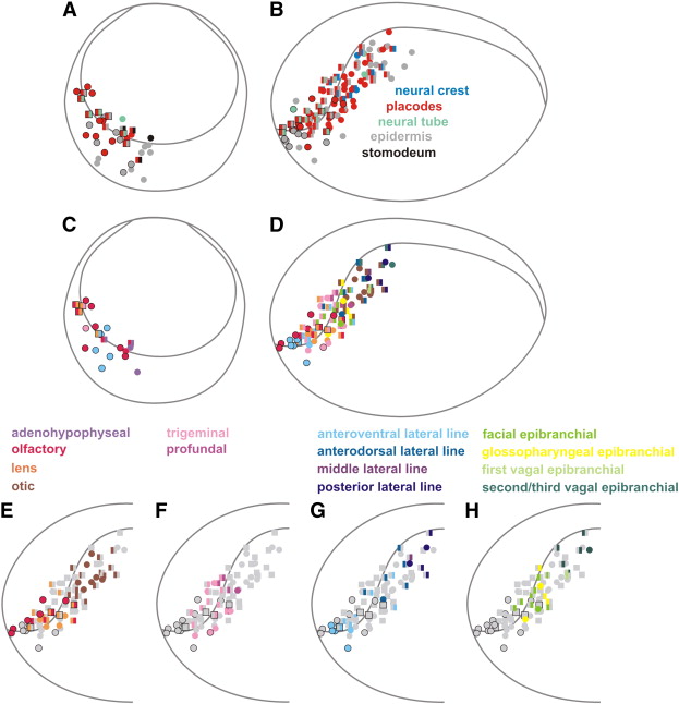Fig. 6. Fate map of Xenopus dorsal cranial non-neural ectoderm at the neural plate stage (stage 13/14). Each symbol represents one dye injection which contributes to a single placode or other ectodermal fates (circle) or to multiple placodes and/or other ectodermal fates (square). Black outlined circles and squares represent injections shown in frontal views as well as in lateral views. The inner gray colored line marks the ventral border of the outer neural folds. Frontal views are shown in A and C and lateral views in B, DâH. Note that only a subset of rostral injection sites mapped from a lateral view were also mapped from a frontal view. A, B: Positions of placodal precursors (red symbols) in relation to precursors of the neural tube (mint symbols), neural crest (blue symbols), epidermis (light gray symbols) and stomodeum (black symbols). All placodes arise from a crescent-shaped area around the anterior neural plate, the pre-placodal ectoderm. C, D: Positions of precursors for different types of placodes (color coded as indicated). There is extensive overlap and co-labeling of precursors for adjacent placodes. EâH: For clarity, these diagrams highlight injection sites contributing to particular subsets of placodes, while injections which contribute to other placodal fates are shown as light gray symbols. E: Adenohypophyseal, olfactory, lens and otic placodes. F: Trigeminal and profundal placodes. G: Lateral line placodes. H: Epibranchial placodes. For detailed explanation see text. |