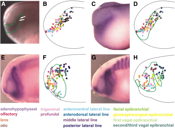Fig. 9. Comparison of Six1 expression in Xenopus with placodal fate maps (lateral views). A, B: Embryo labeled with DiI at the neural plate stage, which was subsequently analyzed by in situ hybridization for Six1. DiI injections (white arrows in A, black circles and arrows in B) are localized within the expression domain of Six1 (outlined by green line) and map well within the pre-placodal ectoderm in the fate map of neural plate stage embryos. CâH: The expression domains of Six1 (C, E, G and green encircled areas in D, F and H) at neural plate stages (C, D), at the end of neurulation (E, F) and in early tail bud stage embryos (G, H) were measured and compared to our fate maps. Six1 expression corresponds overall well to the distribution of placodal precursors in fate maps. However, at early stages, Six1 expression excludes most injections which contribute to the posterior lateral line placode and second/third vagal epibranchial placodes (D, F). These are localized within the expression domain of Six1 only from early tail bud stage on, indicating delayed upregulation of Six1 in these precursors (H). Conversely, Six1 is downregulated in the future lens placode from late neural fold stage on (EâH). Abbreviation: cg: cement gland. For detailed explanation of fate maps, see Figs. 6â8. |