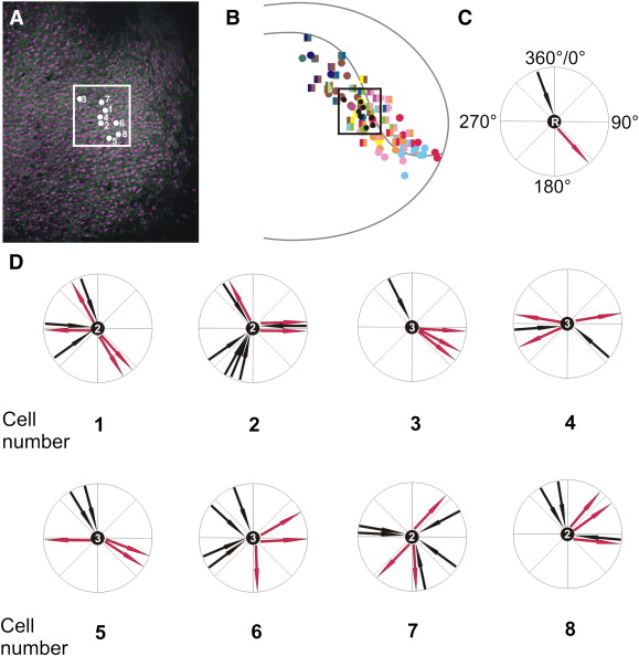 Fig. 12. Analysis of cell neighborhood changes over time. A: Magnified view of rostral non-neural ectoderm of the neural plate stage embryo depicted in Figs. 11AâB (lateral view, anterior is to the right) showing MEM-GFP labeled membranes (green) and H2B-RFP labeled nuclei (red; here shown in magenta false-color). For eight target cells in the deep ectodermal layer (white dots), positions of all neighboring cells including all cells that leave and cease to be neighbors and all cells which become new neighbors were tracked over a time period of 600 min. B: Positions of these target cells (black dots) in relation to the neural plate stage fate map. C: Directions of cells moving away from or towards a target cell (black circle) were depicted as arrows pointing towards or away from it. Red arrows indicate the directions (0°â360°) into which old neighbors were lost, while black arrows indicate directions (0°â360°) from where new neighbors were gained. Directions were categorized into 45° sectors. The number R within the black circle indicates the number of neighbors that do not change over the recorded time period. D: Cell neighborhood changes for each of the eight cells depicted in A. In total, the neighborhood changes of 30 cells were analyzed. |
