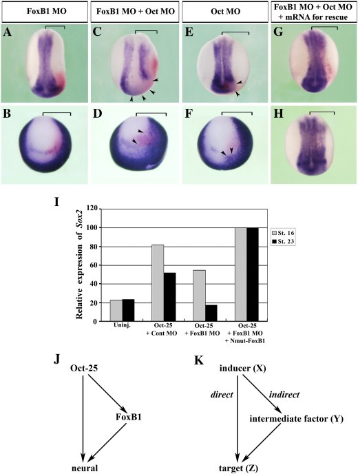 Fig. 7. FoxB1 collaborates with Oct-25 in the process of neural induction. (AâH) FoxB1 acts together with Oct-25 to promote neural development. Together with β-gal mRNA, FoxB1 MO (34 ng; A and B), Oct-25 MO (8.6 ng; E and F), or a combination of both MOs (C and D) were injected unilaterally into both dorsal and ventral animal blastomeres of 8-cell stage embryos. Total amount of injected MO (42.6 ng per embryo) was adjusted by adding Control MO in each experimental group. For rescue experiments, a mixture of MOs and either Nmut-FoxB1 (1000 pg; G) or δBMPR mRNA (1000 pg; H) was injected as described above. Inhibition of both FoxB1 and Oct-25 function resulted in a marked reduction in the expression of Sox2 (arrowheads, C), and also caused the expression of epidermal keratin to extend into neural plate territory (arrowheads, D). Expression of Sox2 (A, C, E, G and H) and epidermal keratin (B, D and F) analyzed by in situ hybridization is shown in purple and β-gal is stained in red. The injected side of the embryo is indicated by brackets. A, C, E, G and H: dorsal views with posterior to the top; B, D and F: anterior (front) view with dorsal to the top. (I) FoxB1 is in part required for neuralization of the ectoderm by Oct-25. A mixture of mRNA and MOs was injected into animal poles at the 4-cell stage: GR-Oct-25 mRNA (1000 pg), Nmut-FoxB1 mRNA (500 pg), Control MO (68 ng), and FoxB1 MO (68 ng). Ectodermal explants were isolated at the blastula stage, treated with DEX to activate Oct-25 and cultured until early neurula (st. 16) or late neurula stage (st. 23). The QPCR data are shown as arbitrary units normalized to ODC expression. (J) FoxB1 and Oct-25 form a regulatory network essential for neural induction processes, which resembles the motif of feed-forward loop networks (K). See Discussion for details. |