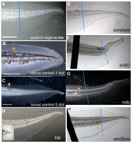 Figure 3. Phenotypes of tails damaged at the regeneration bud and at different levels along the DV axis of the shoulder region.Dorsal is up and posterior is to the right in all images. Typical phenotypes of regenerated tails imaged at stage 48. In all panels, the blue line indicates the amputation plane and the orange arrowhead indicates the position of laser-induced damage. Scale bar = 1 mm. (A) Control tail showing the normal shape of the regenerate. (B,C) Insults to spinal cord show normal development of the tail after 4 hours post laser (hpl) and 9 days post laser (dpl). (D) Image of regenerate after ablation of cells in the regeneration bud (RB: see inset). No observable difference was found when compared to the controls. (E) Ablation of dorsal somite (dorSom) cells does not affect regenerate shape. (F) Ablation of cells in the shoulder spinal cord (shSC) leads to an upward bend. (G, H) Targeting cells of the notochord (Noto) or ventral somites (ventSom) has no effect on regenerate shape. Dark lines in F and H are the staples used to hold tadpoles flat during imaging.