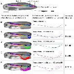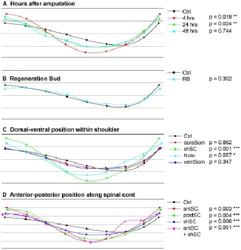 Figure 5. Procrustes profiles of tail morphology after laser treatment.The nine points in all profiles represent the average position of the landmarks used to describe the shape of the regenerate (see Fig. 1E). In all cases the control refers to tails that have regenerated after amputation and all other profiles refer to regenerates after amputation and laser treatment. The numbers next to the legend are the probability that the profile will have that shape. If the P value is <0.05 then we assume the shape is statistically different from the control. The profiles and P values were calculated using Morphometric Geometrics as described in Supporting Information S1. (A) Compares the Procrustes profiles for insults to the shoulder spinal cord (shSC) for different hours post amputation (hpa). (B) Insults to the regeneration bud (RB) are shown not to affect regeneration. (C) For insults along the DV axis, only insults to the shSC and notochord (Noto) were significantly different from the control. Insults to the dorsal somite (dorSom) and ventral somite (ventSom) produced similar regenerates as the controls. (D) Profiles of insults along the AP spinal cord axis. The further anterior the damage, the greater the difference from the control. Even larger shape changes were observed in regenerates that had laser damage at two locations, anterior spinal cord (antSC) and shSC. *** indicates p<0.01, ** indicates p<0.05, * indicates p<0.1.