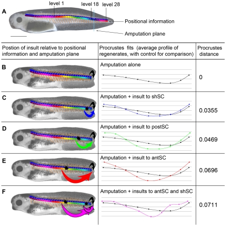 Figure 6. Model of morphogenetic information flow in regenerating tails.(A) An intact stage 40tadpole showing the complete information distribution along the tail. (BâF) A chart of morphogenetic information flow, where the first column shows schematic representations of the information flow, the second column shows the Procrustes fits for tails damaged at specific sites compared with the control, and the final column gives the Procrustes distance between the two shapes. (B) A tadpole with an amputated tail. This diagram shows the flow of information (green arrow) that has been activated by the amputation. The origin of this information is the undamaged tail immediately anterior to the amputation plane. This is equivalent to the control situation. (C) The flow of morphogenetic information in a tail damaged at one site, close to the amputation plane (upper and lower green arrows). These two sources of information are from similar levels along the AP axis, thus carry morphogenetic information that is essentially the same, leading to only a slight affect on the shape of the regenerate. This is equivalent to damaging the shoulder spinal cord (shSC). (D) The information from a more anterior damage site differs more from the information at the cut plane, thus introducing âconflictingâ information to the regeneration process, and causing significant variation in shape of the regenerate, like that caused by damage to posterior spinal cord (postSC). (E) Damage far from the amputation plane will lead to the presence of morphogenetic information even more in conflict with that at the amputation plane, thus causing a severe affect on shape, like damage to anteriorspinal cord (antSC). (F) The flow of morphogenetic information in a tail damaged at two sites. This panel illustrates how information from far anterior conflicts with both the amputation plane and the information from the other damage site, causing different and more severe changes in shape than either site alone, i.e., the greatest Procrustes distance.