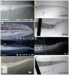 Figure 4. Phenotypes of tails damaged at different sites along the AP axis of the spinal cord.Dorsal is up and posterior is to the right in all images. All tails were damaged at stage 40 and are shown at stage 48. Orange arrowheads point to the location of laser damage; the blue line indicates the amputation plane. Scale bar = 1 mm. (A) The typical upward bend phenotype of tails damaged in the shoulder spinal cord (shSC). (B) Regenerate for tail damaged in the posterior spinal cord (postSC). (C) Image of the more severe phenotype caused by ablation of the anterior spinal cord (antSC). (D) Dorsal view of the tail shown in C illustrating the lateral bending of tails damaged in the antSC. (E and F) A tail damaged at two sites, the antSC and the shSC. This tail shows both characteristics of tails damaged at either shSC or antSC, including a simple upward bend, and LR bending. (G) The “pigtail” spiraling at this tail tip is unique to tails that have been damaged at both antSC and shSC.