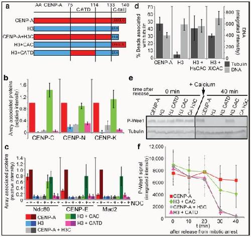 Figure 4. The CENP-A C-terminus is required for centromere and kinetochore assembly in Xenopusegg extract(a) A schematic showing the different CENP-A/H3 chimeras used in this study. The numbers on top represent the amino acid (AA) within HsCENP-A. (b) Quantification of immunofluorescence analysis of CENP-C, CENP-K and CENP-N recruitment to wild type and chimeric arrays. The relative amounts of each centromere protein bound to the arrays are shown relative to CENP-A arrays set to 1. Error bars represent SEM, n = 3 (p ≤ 0.05 for all proteins binding to CENP-A arrays compared to chimeric arrays except for the H3 arrays containing the CENP-A C-terminus). (c) Quantification of immunofluorescence analysis of Ndc80, CENP-E, Mad2 recruitment to chimeric chromatin arrays with (+) and without (−) nocodazole (NOC). Values are displayed relative to CENP-A arrays in the presence of nocodazole set to 1. Error bars represent SEM, n = 4. The efficiencies of recruitment of kinetochore proteins to CENP-A and H3+CAC arrays in nocodazole were not statistically distinguishable (p ≥ 0.26 for Ndc80, CENP-E and Mad2). (d) Quantification of microtubule binding to CENP-A, H3, H3+HsCAC and H3+XlCAC chromatin arrays represented as percentage of beads associated with tubulin levels above threshold (dark grey bars, left y-axis). Average DNA levels on chromatin beads are shown representing the levels of chromatin arrays bound to beads (light grey bars, right y-axis). Error bars represent SEM, n = 4 for CENP-A and H3 arrays, n = 5 for H3+HsCAC arrays and n = 2 for H3+XlCAC arrays. (e) Western blot analysis shows phospho-Wee1 (P-Wee1) levels as an indicator of the cell cycle stage at t 0′ (0 min) and t 40′ (40 min) after mitotic exit. Tubulin levels are shown as a loading control. (f) Quantification of the phospho-Wee1 signal intensity over time (P-Wee1). Error bars represent SEM, n = 5.
