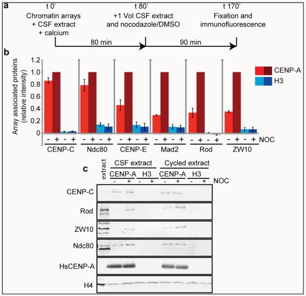 Figure 2. CENP-A chromatin specifically recruits kinetochore proteins as a response to a mimic of kinetochore detachment from microtubules(a) A schematic showing the experimental procedure. (b) Quantification of immunofluorescence analysis of CENP-C, Ndc80, CENP-E, Mad2, Rod or ZW10 recruitment to chromatin arrays with (+) and without (−) nocodazole (NOC). The levels are rescaled so that CENP-A arrays with (+) nocodazole are set at 1. Error bars represent SEM, n = 3 (p < 0.05 between − and + nocodazole for CENP-E, Mad2, Rod and ZW10 binding to CENP-A chromatin arrays). (c) Western blot analysis of CENP-C, Ndc80, Rod and ZW10 recruitment to CENP-A and H3 chromatin arrays with and without (+/−) nocodazole (NOC) in CSF and cycled egg extracts. H4 levels are shown as a loading control.