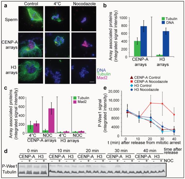 Figure 3. Kinetochores assembled on reconstituted CENP-A chromatin bind microtubules and generate a mitotic checkpoint signal(a) Representative images of microtubule polymerization induced by sperm or reconstituted CENP-A and H3 chromatin. Microtubules (green) and Mad2 (magenta) levels are shown. Scale bar, 10μm (b) Quantification of tubulin and DNA associated with CENP-A and H3 chromatin beads. Error bars represent SEM, n = 5 (c) Quantification of tubulin and Mad2 levels associated with CENP-A and H3 chromatin beads after cold shock (4°C) and nocodazole (NOC) treatment. Error bars represent SEM, n = 5 (d) Western blot showing phospho-Wee1 (P-Wee1) levels as an indicator of the cell cycle stage and tubulin levels as a loading control. Samples from different time points after release from mitotic arrest (t 0′, t 10′, t 20′, t 30′, t 40′) are shown for CENP-A and H3 chromatin arrays, each incubated with nocodazole (+) or with DMSO (−) as a control. (e) Quantification of four independent experiments showing the phospho-Wee1 signal intensity (P-Wee1 signal) over time (min). Error bars represent SEM, n = 4.