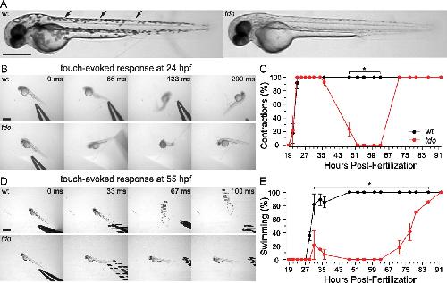 touchdown mutants are hypopigmented and display a transient loss of touch-evoked behaviors. A, Lateral view of wild-type (left) and touchdown mutant (right) larvae at 55 hpf. Arrows point to a few of the visible melanophores, which contribute to pigmentation in wild-type zebrafish but are missing in touchdown larvae. Scale bar, 200 μm. B, Frames of videos showing touch-evoked escape contractions at 26 hpf of wild-type (top) and touchdown (bottom) embryos. 0 ms is the video frame preceding contact of the embryo by the stimulating probe. Scale bar, 500 μm. C, The percentage of wild-type (black) and touchdown mutants (red) displaying touch-evoked contractions between 19 and 92 hpf (n = 24 from three clutches) showing that touchdown mutants do not respond between 52 and 63 hpf. Values represent the average ± SEM. *p < 0.05, t test. D, Video frames showing touch-evoked swimming at 55 hpf of wild-type (top) but not of touchdown (bottom) larvae. Of note, swimming larvae sometimes appear in two places as the behavior was faster than the sampling rate of the camera. Scale bar, 500 μm. E, The percentage of wild-type (black) and touchdown mutants (red) displaying touch-evoked swimming between 19 and 92 hpf (n = 24 from three clutches). |