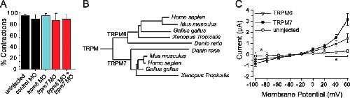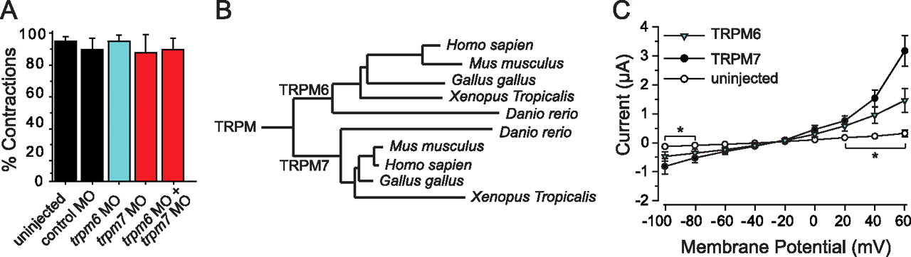 The touchdown phenotype results from the loss of TRPM7 during larval development. A, Histogram showing the percentage of embryos injected with the indicated antisense MO that responded to tactile stimuli with escape contractions at 24 hpf (n > 60 from three clutches). Injection of trpm7, trpm6, and trpm7+ trpm6 antisense MOs did not affect touch-evoked contractions. B, A phylogenetic tree showing the assignment of the identified protein as the zebrafish ortholog of TRPM6. C, Average current responses of oocytes expressing wild-type TRPM7 or TRPM6 to voltage ramps between −100 and +60 mV (n = 10 for each allele), showing that TRPM6 exhibits a outwardly rectifying current similar to TRPM7. *, Current values of TRPM6 and TRPM7 that were significantly different from uninjected controls (p < 0.05). The amplitude of TRMP6 responses at +60 mV was significantly smaller than TRPM7 responses. |