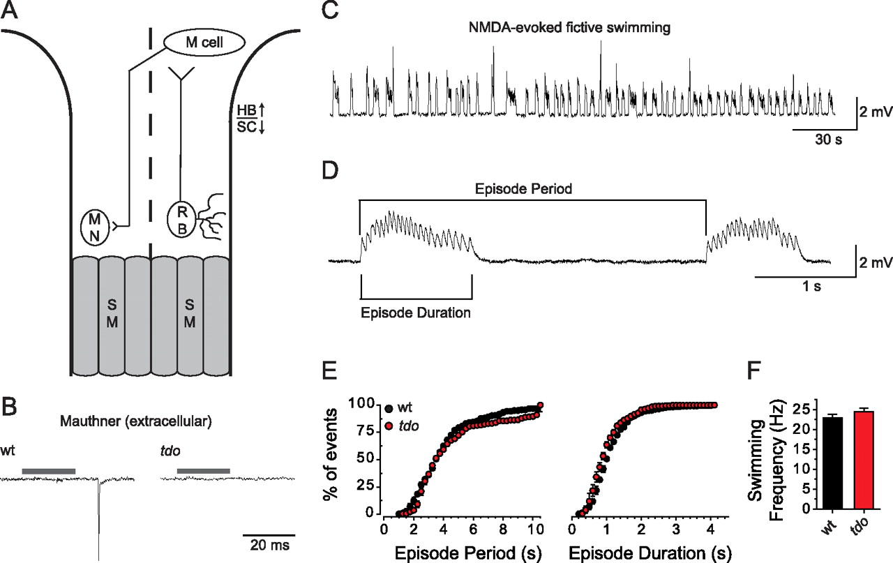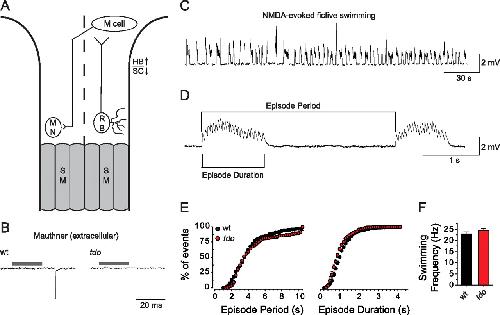 Tactile stimuli in touchdown mutants fails to activate second-order neurons and the locomotor network that generates swimming in zebrafish. A, Schematic of a minimal touch-evoked circuit in zebrafish. MN, Motor neuron; SM, skeletal muscle; HB, hindbrain; SC, spinal cord. Dashed line designates the dorsal midline; anterior is up. B, Extracellular recordings from wild-type and touchdown mutant larva using electrodes positioned to detect Mauthner neuron spikes showing that tactile stimulation activates M cells in wild-type but not touchdown larvae at 55 hpf. Gray bars indicate time of the stimulus to the puffer pipette. C, Several minutes of NMDA-evoked fictive swimming episodes recorded from axial skeletal muscle in a wild-type larva (55 hpf) in the presence of 3 μM curare, a concentration sufficient to attenuate membrane depolarization below the level necessary to induce excitationâcontraction coupling. D, A faster sweep of NMDA-evoked fictive swimming detailing episode period, episode duration, and swimming frequency (frequency of endplate potentials within an episode). The first episode lasted 1.06 s and had 22 peaks, for a swim frequency of 20.75 Hz. E, Cumulative plots of episode periods and durations in wild-type and touchdown mutant larvae showing that episode period and durations are not affected by the mutation. F, Histogram showing that the frequency of NMDA-evoked fictive swimming is comparable between wild-type and touchdown mutant larvae (n = 5 for each). |
