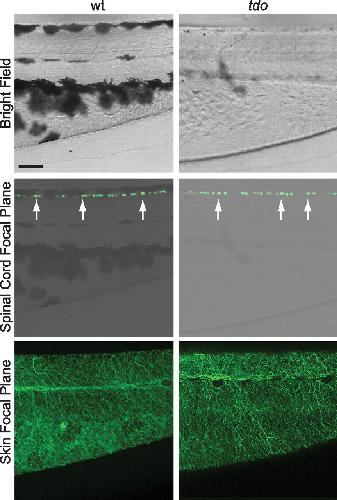 The gross morphology of RBs appears normal in touchdown mutants. Top, A lateral bright field view of the trunk and tail regions from ssx-mini-ICP:eGFP transgenic wild-type and touchdown mutant larvae at 55 hpf. Rostral is to the left and dorsal is up. Scale bar, 50 μm. Middle, Confocal microscope view of the same regions displaying RB cell bodies (detected by using anti-GFP and a fluorescent secondary antibody) superimposed over the bright field image. The microscope was focused at the level of the RB cell bodies. Bottom, The same larvae viewed in a different focal plane that highlights RB peripheral neurites within the skin. |