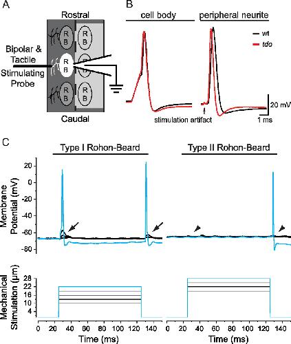 Cutaneous mechanoreceptors respond to tactile stimuli in touchdown mutants. A, A representation of the preparation used to record electrical and tactile-evoked responses in RBs. The dashed line designates the dorsal midline. The light gray area indicates the region in which the skin and muscle were removed to allow access to a contralateral RB cell body with an intact peripheral neurite (white). The stimulating probe was placed on the skin directly overlying the peripheral neurite. B, RB responses to depolarizing current injections (2 ms) to the cell body, and extracellular electrical stimulation (1 ms) of the peripheral neurite showing that the RBs are excitable in wild-type and touchdown mutant larvae. C, Touchdown mutants possess both type I and type II RBs (see text). In type I RBs, a subthreshold tactile stimulus (black) applied to the peripheral neurite resulted in an observable generator potential (arrows) at the onset and offset of the stimulus. In these RBs, increasing the amplitude of stimuli eventually triggered action potentials (cyan) at the onset and the offset of the stimulus. In type II RBs, activation by tactile stimuli produced action potentials (cyan) without visible generator potentials (arrowheads) in response to subthreshold stimuli (black). |