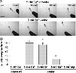 Elevation of extracellular divalent cations rescues touch responsiveness in touchdown mutants. A, Video images of 55 hpf touchdown mutant larvae in 5 mM Ca2+ showing no response to touch when the skin was not removed (top), and exhibiting swimming in response to touch when the skin over several rostral somites (∼5–10) had been peeled, allowing rapid diffusion of elevated divalent cations into the CNS (bottom). 0 ms is the video frame preceding contact of the embryo by the stimulating probe. Scale bar, 1 mm. B, Average responsiveness of unpeeled touchdown mutant larvae in the presence of 5 mM Ca2+ to tactile stimuli compared with peeled mutant larvae in the presence of 5 mM Ca2+, Ba2+, Sr2+, or Mg2+ (n = 15 from three clutches). Ca2+, Sr2+, and, to a lesser extent, Ba2+, but not Mg2+, increased responsiveness to touch of peeled touchdown mutants. *p < 0.05, t test. |