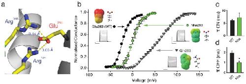 Figure 4. Glu283 is likely to form a state-dependent electrostatic charge-charge interaction with S4 charges(a) Model highlighting the proximity of Glu283 to Arg 368 and Arg371 (PDB 2R9R); (b) Effects on GV by natural (Glu, Gln) and unnatural (Nha) side-chains at position 283 (V1/2 = 58.1 ± 2.0 mV for Gln283 (n = 4); V1/2 = 0.9 ± 2.1 mV for Nha283 (n = 8) and V1/2 = −22.1 ± 0.7 mV for Glu283 (WT)); insets show currents, ESP maps and energy minimized structures of natural and unnatural amino acids used at position 283 with scale for ESPs as in Fig. 2a; (c)/(d) Time constants of activation obtained from a depolarizing pulse from −80 mV to −25 mV (c) and time constants of deactivation obtained from a repolarizing pulse from from +20 mV (WT) or +40 mV (Nha283) to −25 mV (d) with Nha at positions 293 and 316 (all data fit with a single exponential, n = 5); asterisk indicates significant difference (p < 0.05); Scale bars: 2 μA for current, 50 ms for time.