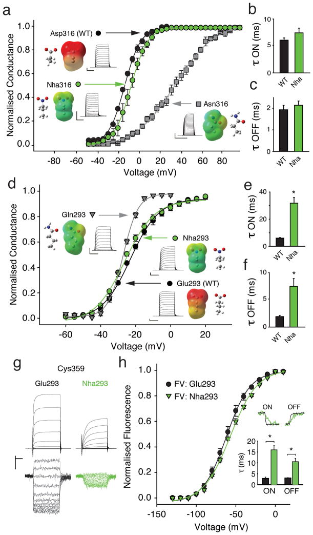 Figure 2. Contributions of Asp 316 and Glu293(a) GV of natural (Asp, Asn) and unnatural (Nha) side-chains at position 316 (Asn316: V1/2 = 27.8 ± 3.3 mV; Nha316: V1/2 = −17.5 ± 2.3 mV; Asp316 (WT): V1/2 = −22.1 ± 0.7 mV, (n = 5–6)); insets show currents, electrostatic surface potential (ESP, red = −100 kcal/mol, green = 0 kcal/mol, blue = +100 kcal/mol) maps and energy minimized structures of side-chains; (b)/(c) Activation time constants (−80 mV to −25 mV) and deactivation time constants (+20 mV to −25 mV) for Asp316 and Nha316 (single exponential fit, n = 5); (d) GV of natural (Glu, Gln) and unnatural (Nha) side-chains at position 293; insets as in (a); (Gln293: V1/2 = −27.1 ± 0.5 mV; Nha293: V1/2 = −24.8 ± 0.8 mV; Glu293 (WT): V1/2 = −22.1 ± 0.7 mV (n = 4–6)); (e)/(f) Time constants of activation (e) and deactivation (f) for Glu293 and Nha293 (n = 5–7); protocol as in (b)/(c)); (g) Current (upper panel) and fluorescence (lower panel) recordings for Glu293 (WT) or Nha293 background, in black and green, respectively; (h) FV for Glu293 and Nha293 (V1/2: −63.1 ± 3.0 mV and 58.3 ± 1.8 mV, respectively; n = 4). Upper inset shows fluorescence sample traces (ON: −80 mV to −50 mV, OFF: +20 mV to −50 mV); lower inset shows averaged time constants (n = 4). Scale bars: 2 μA for current, 1 % for fluorescence and 50 ms for time (except 20 ms for Asn316). Asterisk indicates significant difference (p < 0.05).