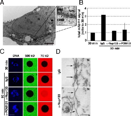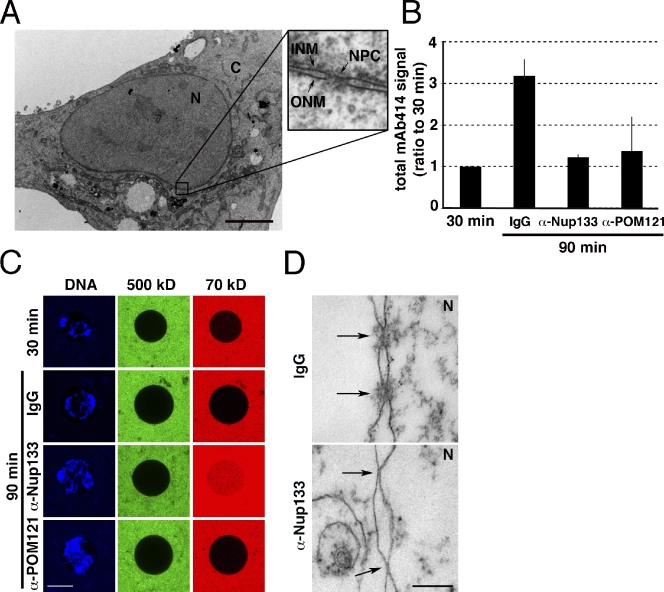 Figure 1. POM121 is involved in the fusion of inner and outer nuclear membranes in vitro. (A) Transmission electron micrograph of a U2OS cell. Inset shows INM, ONM, and NPC. (B) Quantification of total mAb414 signal in nuclei assembled in vitro from Xenopus egg extracts for 30 min and then incubated for 60 min with either control IgG or inhibitory antibodies against Nup133 or POM121. Error bars are standard deviation. (C) Nuclei described in B were incubated in the presence of 500-kD and 70-kD fluorescent dextrans and imaged to assay for INM/ONM fusion. (D) TEM of in vitro assembled nuclei described in B. Arrows show NPCs (top) and NPC intermediates (bottom). Bars: (A and C) 5 µm; (D) 200 nm. N, nucleoplasm; C, cytoplasm.
