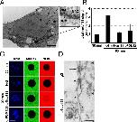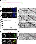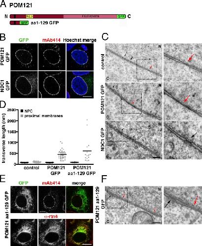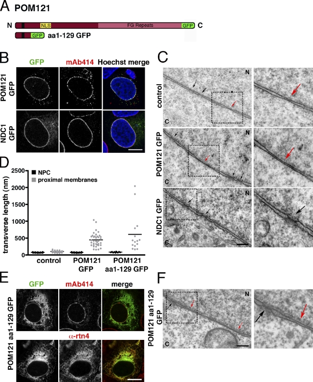 Figure 3. POM121 plays a role in juxtaposing inner and outer nuclear membranes. (A) Schematic representation of POM121 and truncation mutant fusion proteins. (B) POM121-GFP and Ndc1-GFP fusion plasmids were transfected into U2OS cells and immunostained with mAb414 to verify correct localization of the fusion proteins to the NE/NPCs. (C) Cross-sectional TEM of the NE in control or U2OS cells transfected with the GFP fusion proteins described in B. (D) Quantification of NPC width and transverse sectional lengths of reduced membrane spacing in control or cells expressing POM121-GFP or POM121 aa1–129-GFP. n > 9 measurements per condition. Horizontal bars are mean lengths. (E) POM121 aa1–129-GFP was transfected into U2OS cells and immunostained with either mAb414 or α-rtn4a. (F) Cross-sectional TEM of the NE in a U2OS cell transfected with POM121 aa1–129-GFP. (C and F) Right images are enlargements of the boxed areas on the left. Black arrows mark NPCs, and red arrows show areas of reduced membrane spacing. Bars: (A and E) 10 µm; (C and F) 200 nm. N, nucleoplasm; C, cytoplasm.