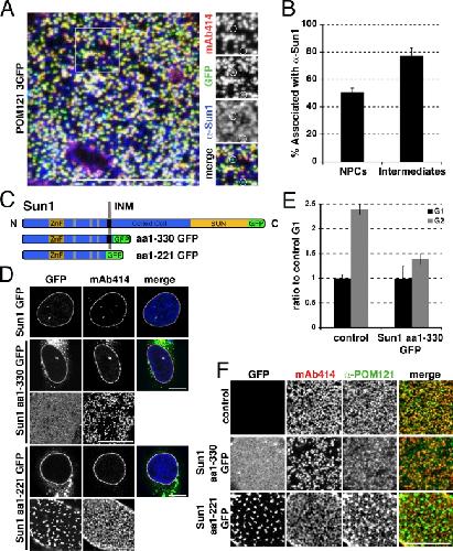 Figure 5. Sun1 and POM121 collaborate during early steps of NPC assembly. (A) U2OS cells were transfected with POM121-3GFP and immunostained with mAb414 and α-Sun1 antibodies. Circles indicate loci at the nuclear surface containing GFP and Sun1 signal without mAb414. The box represents the area of zoomed in images on the right. (B) Quantification of NPCs and NPC intermediates overlapping with the Sun1 signal. n > 5 nuclear surfaces. Error bars are standard error. (C) Schematic representation of Sun1 and truncation mutant fusion proteins. C, carboxy terminus; N, amino terminus; ZnF, zinc finger. (D) Sun1-GFP, Sun1 aa1–330-GFP, and Sun1 aa1–221-GFP fusion plasmids were transfected into U2OS cells and immunostained with mAb414 to verify localization of the fusion proteins to the NE. (E) Quantification of total mAb414 fluorescence during G1 and G2 in control and U2OS cells transfected with Sun1 aa1–330-GFP. n > 60 nuclei per condition. Error bars are standard error. (F) Sun1 aa1–330-GFP and Sun1 aa1–221-GFP were transfected into U2OS cells that were immunostained with mAb414 and α-POM121 antibodies and imaged at the nuclear surface. Bars, 10 µm.